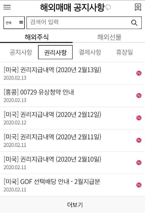 대신증권 크레온 앱에서 배당금 지급내역을 확인할 수 있습니다. 해외주식에서 투자정보 - 공지를 들어가시면 해외매매 공지사항이 나옵니다. 거기에서 해외주식 - 권리사항을 누르시면 권리지급내역이 나옵니다. 오늘은 2월 13일이니까 여기로 들어가보겠습니다.