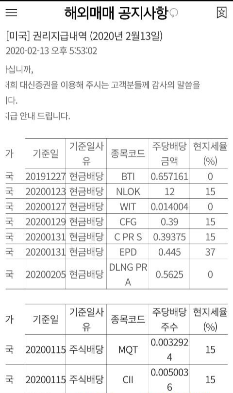 그리고 대신증권 크레온 앱으로 확인가능합니다. 물론 현지세로 약 3.6달러 정도 빠져나갑니다. 그럼 결국 20.4달러정도 배당금을 받은 셈입니다.